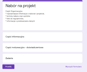 Formularz naboru składa się z czterech sekcji, każda sekcji jest obowiązkowa i bez jej wypełnienia nie ma możliwości wysłania formularza.
