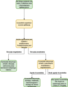 Aby dołączyć do Cherry-IT: Projekty należy wysłać formularz naboru i otrzymać pozytywną odpowiedź. Pełny przebieg procesu rekrutacyjnego przedstawiony został na diagramie poniżej, wraz z opisem poszczególnych kroków.